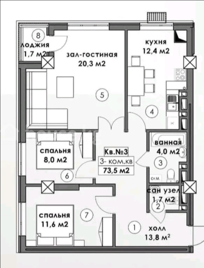73.5 м2, жилая: 58 м2, кухня: 15 м2