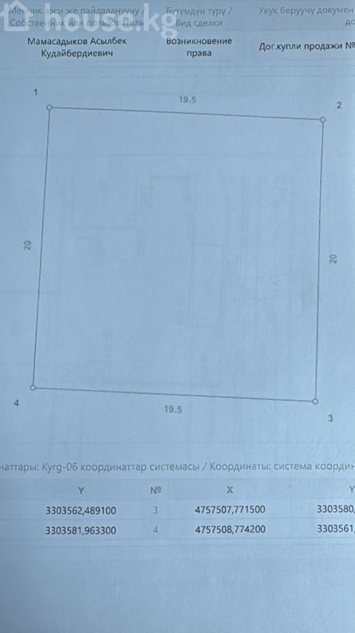 Продается участок Район: Арча-Бешик, ул. Ойсул-Ата Отличный район Площадь участка: 3,9 сотки Размер участка: 19.5 \ 20 м Цена: 156 000 $ Цена в сомах: 15 609 825сом ID: 84954