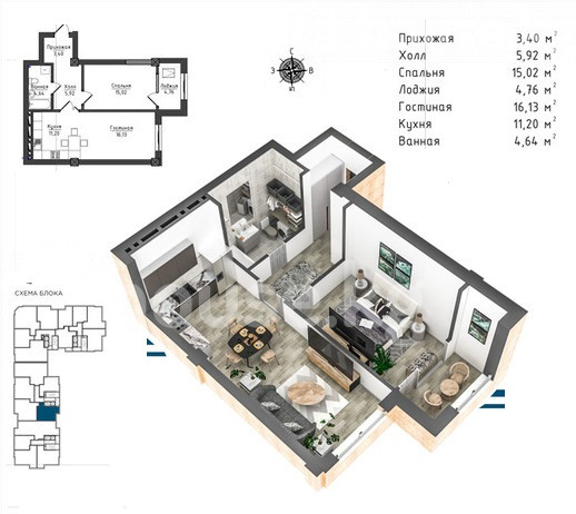 2-комн. кв., 60 м2
