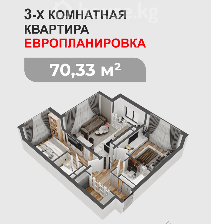 3-комнатная квартира в ЖК Tokyo City, 15 этаж(лифт будет функционировать во время ремонта!) Площадь — 70,33 м², европланировка, сдача — II квартал 2027 г. Квартира в отделке White Box — стяжка и штукатурка , можно сразу начинать чистовой ремонт. Преимущества: • Уникальная планировка: просторная кухня-гостиная, две спальни, раздельный санузел,балкон и кладовая — редкость для этого сегмента 🔥 • Окна на юг и восток, не во двор — много света и более чистый воздух на высоте 🌤️ • Smart ID двери, скоростные лифты, отличная шумоизоляция • Рядом TechnoPark — будущий IT-центр Бишкека, район активно развивается 🚀 • Строятся новые дороги и развязки, быстрый выезд в любую часть города • Локация почти центральная, но тише и комфортнее 🌆 Надежный застройщик, красная книга, все разрешительные документы 👍🏻