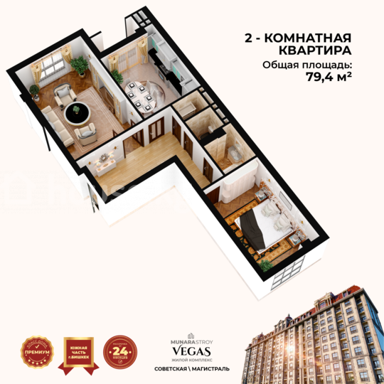 Срочно продается для Флипинга 2шка 79,70м2 ЖК Вегас СК Мунара 79м2 сквозная планировка окна на Юг\Север(горы) можно начинать ремонт этаж 5 из 13 всего за 94000 долларов 8206000 сом Жылдыз 0706775477 ID: 71467