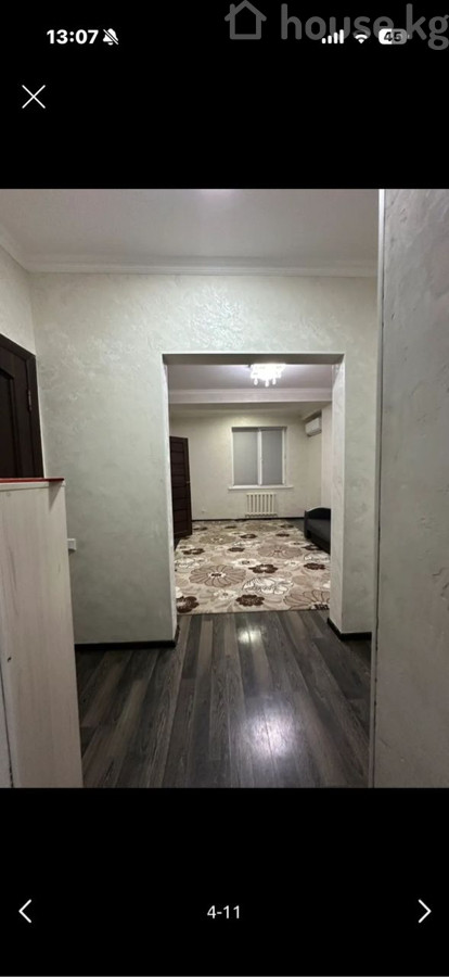 Сдаётся светлая однокомнатная квартира с продуманной планировкой. Адрес: Исакеева20 блок11 квартира 33 ДЕПОЗИТ 25000 Описание и оснащение: - Просторная комната с большим ковром в нейтральных бежево-коричневых тонах, окно с жалюзи, радиатор отопления. - Установлен кондиционер на стене. - Входная зона и коридор с качественным тёмным ламинатом; декоративная штукатурка на стенах, белые потолочные карнизы/плинтуса. - Межкомнатные двери из тёмного дерева с фурнитурой под латунь. - В комнате размещён диван. - Потолочный светильник в зале. - На кухню ведёт отдельный проём; виден холодильник. - Домофон/аудиотрубка у входа. - Аккуратная электрофурнитура, розетки и выключатели в каждой зоне. Подойдёт для комфортного проживания: чистые светлые стены, удобное зонирование, есть базовая мебель и техника (диван, холодильник, кондиционер).