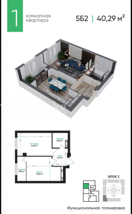 1 комнатная квартира с продуманной планировкой в ЖК Эсентай, от строительной компании "Артвин". квартира на 11 этаже, с прекрасным видом на горы и город! Район Академия МВД. Блок 2, общая площадь 40,29 м² (тип 5Б2). - Гостиная 14,28 м² - Кухня 13,66 м² - Лоджия 3,80 m² - Санузел 3,80 м² - Холл 4,75 м² Функциональная планировка: изолированная кухня с выходом на лоджию, отдельная гостиная правильной формы, просторный холл, совмещённый санузел. Есть ватсап.