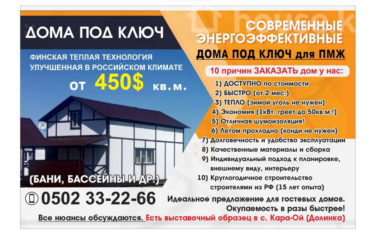Продаётся мобильный финский коттедж ИНХаус (не контейнер!) – готовое решение для дачи, бизнеса или постоянного проживания! Площадь: ~15 м² Состояние: новое Полностью готов к проживанию Локация: возможна доставка в любую точку (дом легко перевозится). Есть в продаже участок для строительства по 23000$ (4сот.) возле будущего спорткомплекса FIFA (строительство скоро уже начнется). Описание: Продаётся компактный и полностью укомплектованный мобильный дом ИНХаус. Идеален для размещения на даче, в садовом товариществе, на участке без капитального строительства, а также под аренду или глэмпинг-бизнес. Дом утеплён, с электропроводкой, освещением и полной внутренней отделкой. ИНХаус - это энергосберегающий дом и расходы на отопление минимальны - вас приятно очень удивят! Планировка и оснащение: Кухня-гостиная с окном и рабочей зоной Встроенная мини-кухня: холодильник, варочная панель, мойка Обеденная зона со столом и стульями Отдельная спальня с двуспальной кроватью Полноценный санузел: душ, унитаз, бойлер, раковина Современная внутренняя отделка, ламинат Внешняя обшивка – металл (не боится дождя, солнца и времени) Преимущества: ✔️ Дом не требует фундамента — можно установить сразу ✔️ Быстрая установка и подключение к коммуникациям ✔️ Отлично подойдёт для ПМЖ, дачи или сдачи в аренду ✔️ Возможна доставка и помощь с установкой ✔️ Экономия на стройке, без потери комфорта, без рисков Цена ниже рынка за готовое жилое решение. Готовое решение - ИНХаус - это про всё ИНключено! Звоните или пишите — вышлем видео, расскажем детали, покажем вживую!
