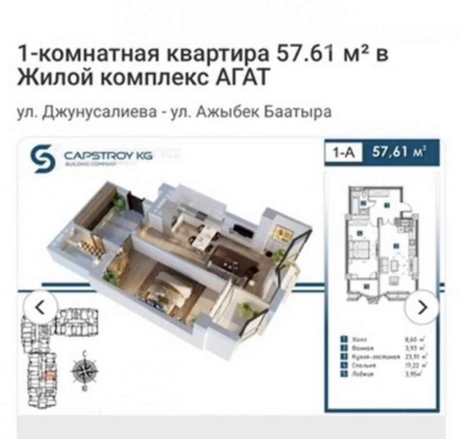 Продается 2шка студия ск кап строй жк Агат 57.6м2 этаж 13/16 Можно начать ремонт Цена 88.000$ Тел 0501 777 856 Темирлан Кыргыз Недвижимость ID: 75179
