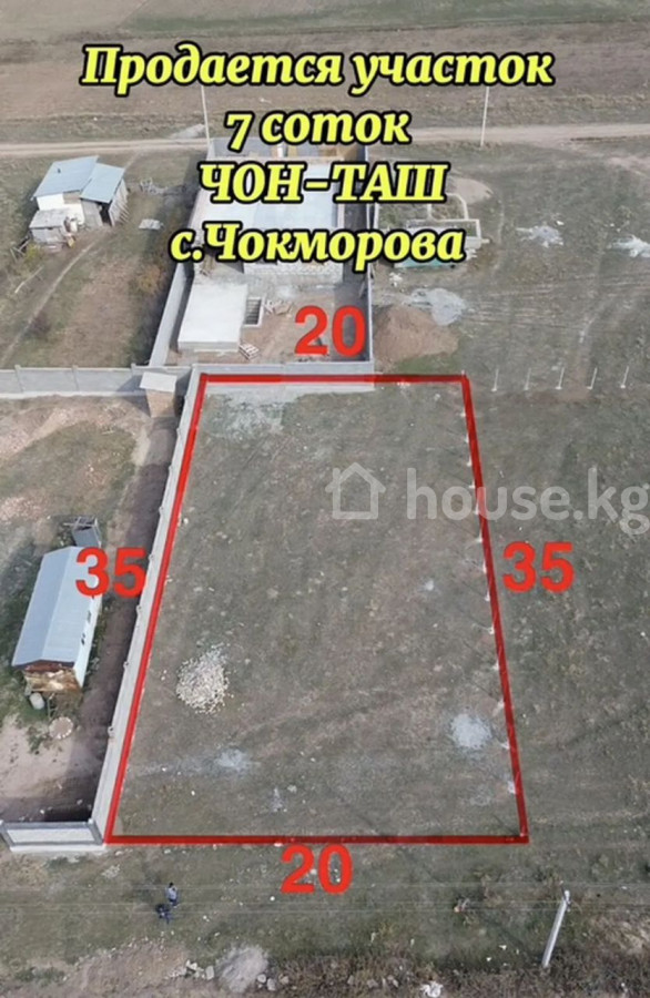 Земельный участок 7 соток, Чон-Таш, с. Чокморова. - Правильная прямоугольная форма: ориентировочные размеры 20×35 м (фасад 20 м). - Ровный рельеф, участок размежёван красной линией на фото. - Соседи застроены, подъезд по грунтовой дороге. - По периметру частично возведён забор/ ограждение. - Подходит для индивидуального Жилого Дома, сада, хозпостроек. Отличная геометрия участка и удобная ширина фасада для планировки дома и двора. Айзирек Кыргыз недвижимость ID: 78974