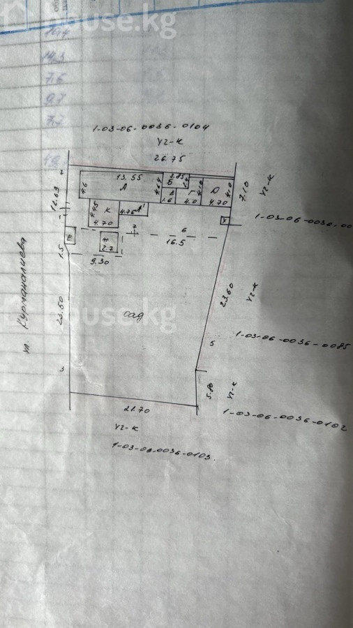 Участок прямоугольной формы со старым домом 47 квадратных метров (пригодный к жизни, но с очень старым ремонтом). Проведён газ, электричество, вода. Адрес: Курманалиева 109 2gis: https://2gis.kg/bishkek/search/%D0%9A%D1%83%D1%80%D0%BC%D0%B0%D0%BD%D0%B0%D0%BB%D0%B8%D0%B5%D0%B2%D0%B0%20109/geo/15763234351039100/74.652841%2C42.887359?m=74.653067%2C42.887184%2F18 Есть хоз. постройки, в том числе баня, в хорошем состоянии. Все постройки на одной стороне участка, большая территория не застроенная, в данный момент используется как сад. По документам 6,6 соток, фактически 9 соток. Есть все документы (красная книга, тех. паспорт, договор купли-продажи). Хорошо подходит под коммерцию не требовательную к трафику. Рядом: Аламединский рынок Школа №115, Частная школа Erke Line Много СТО'шек такие как Арсенал, Чемпион, Гранд Поинт и т.д. Фулфилмент Таатан РОВД района Собственник, БОЛЬШАЯ ПРОСЬБА АГЕНСТВАМ/РИЭЛТОРАМ - НЕ БЕСПОКОИТЬ!