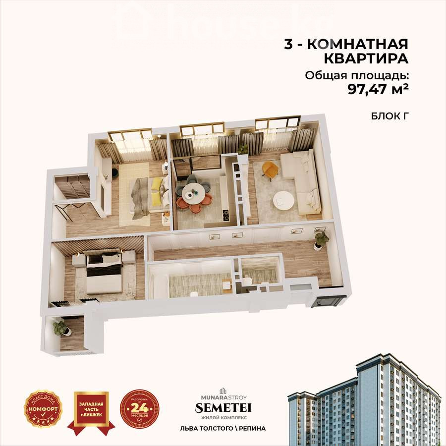 🏡 Продается 3-комнатная квартира — 97,47 м² 📍 ЖК «Семетей» от СК Мунара Строй, блок Г 📍 г. Бишкек, ул. Репина / Льва Толстого 💰 Цена: 96 500 $ 📞 Звоните: 0 709 022 013 ________________________________________ ✅ Квартира в ПСО — дом сдан! ✅ Можно сразу начинать ремонт! ✅ Установлены 2 бесшумных лифта! ✅ Центральные коммуникации, отопление от ТЭЦ ✅ Отличный вид на горы ________________________________________ 📐 Планировка и метраж: • Общая площадь: 97,47 м² • Этаж: 11 из 12 (есть тех.этаж) • Зал: 15,74 м² + балкон 2,85 м² • Кухня: 16,21 м² • Спальня 1: 19,55 м² • Спальня 2 с гардеробной: 23,20 м² • Прихожая: 14,19 м² • Санузлы раздельные — 3,68 м² и 2,05 м² ________________________________________ 📍 В пешей доступности: • Парк Пишпек, детский сад №53 • Школы №40, №44, №59 • Магазины, аптеки, кафе • Поликлиника, отделение милиции • Строится Royal Central Park — район активно развивается! ________________________________________ 💬 Торг уместен после осмотра! 📞 Звоните прямо сейчас: 📱 0 709 022 013