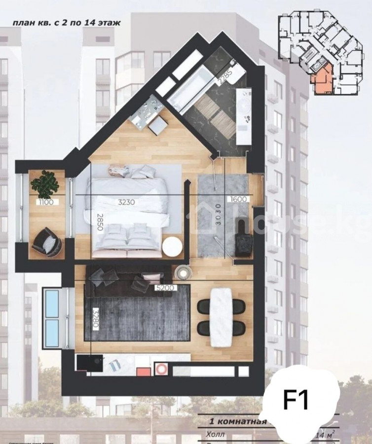 1-бөлм. бат., 42.44 м2