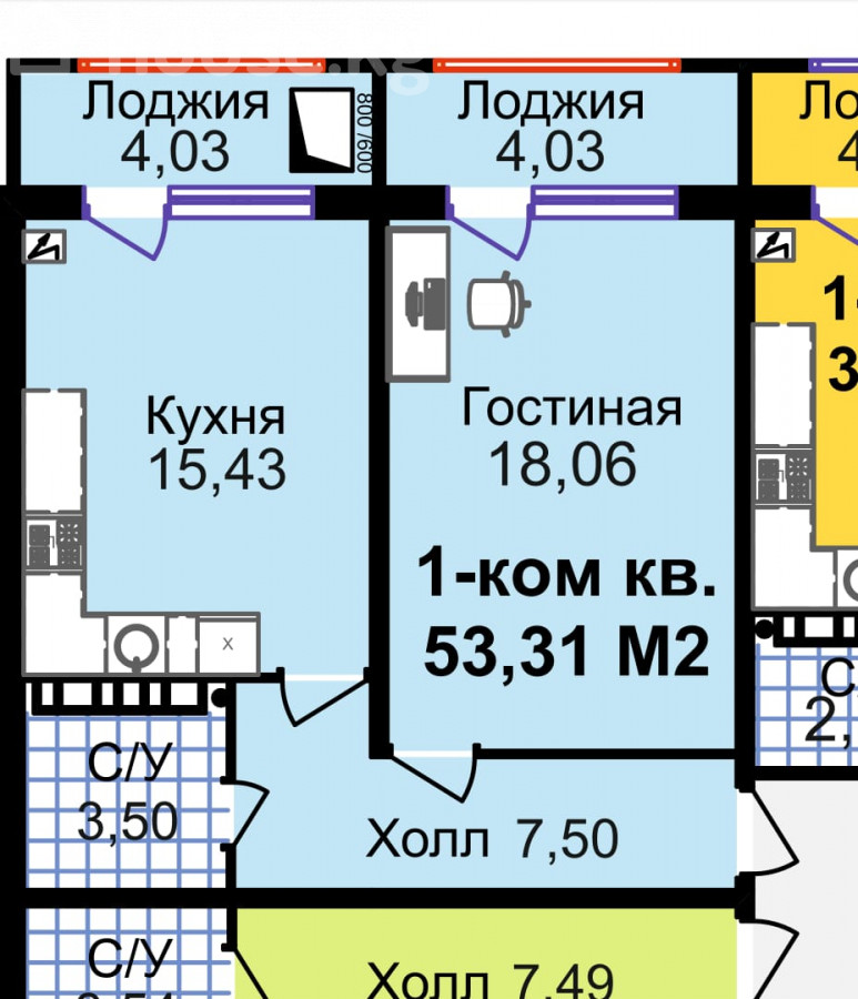 1-комн. кв., 54 м2, 8 этаж из 9