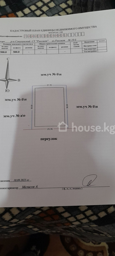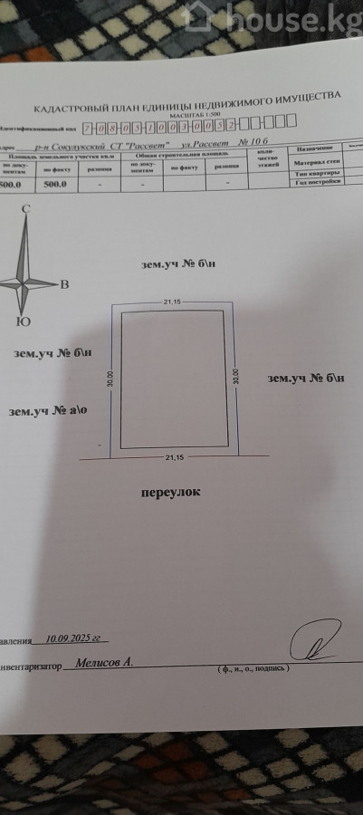 Продается участок 7,1 соток р-н Сокулукский, СТ «Рассвет», ул. Рассвет, №10 - Площадь: 500 кв.м (по документам и факту). - Форма и размеры по кадастровому плану: фасад 21,15 м, глубина 30,00 м. - Границы: с южной стороны — переулок; по бокам и с тыла — соседние зем. участки. Цена 282000$ ID: 78250