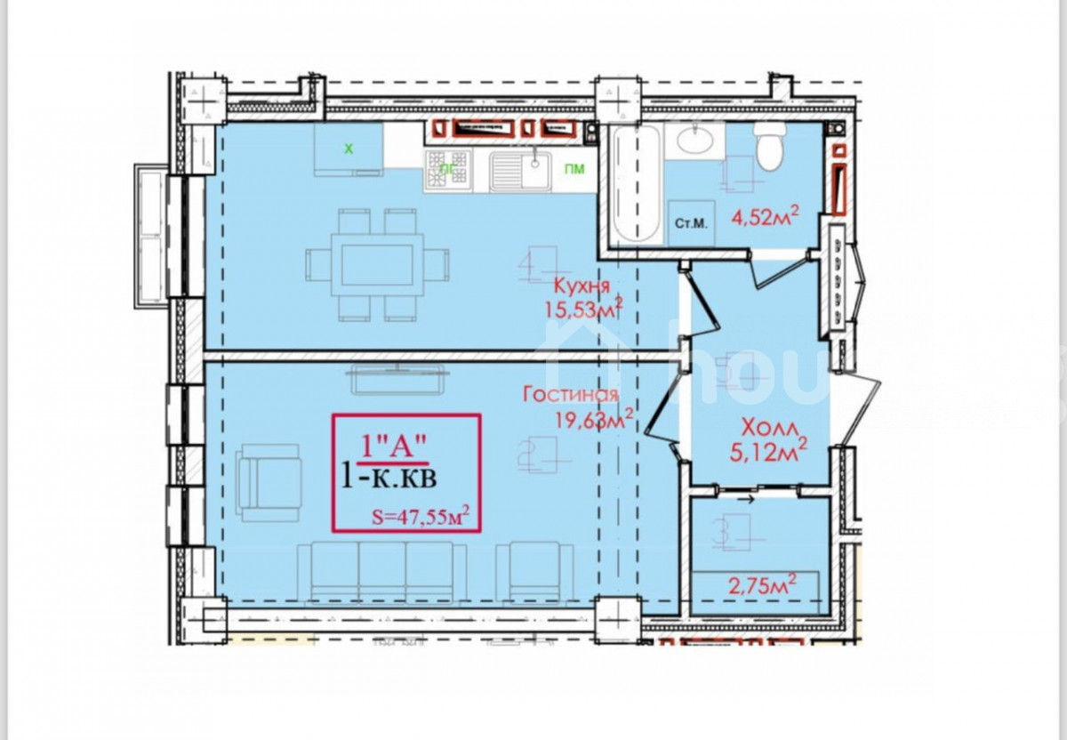 1-room apartment, 47.55 sq. m