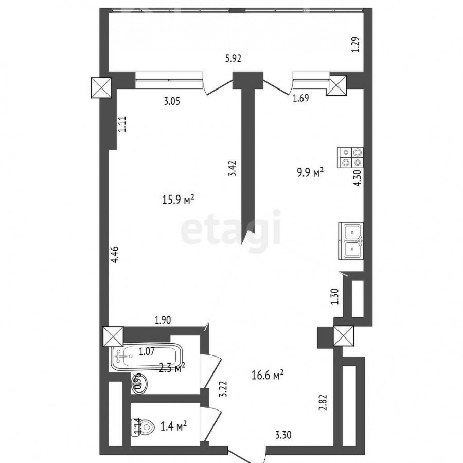 46.1 sq. m, living: 15.9 sq. m