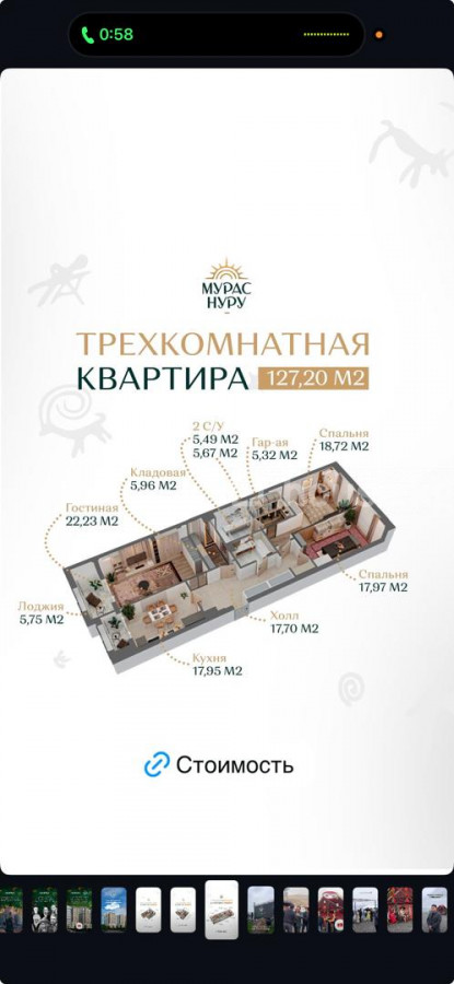 Продается 3 комнатная квартира ЖК " Мурас Нуру" Этаж 11/13 127.20 м2 Блок Г Сдача август 2027г Цена:145000$ 0707-99-34-99 Айданбек ID: 80860