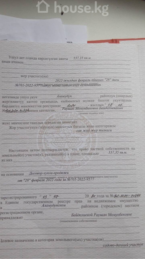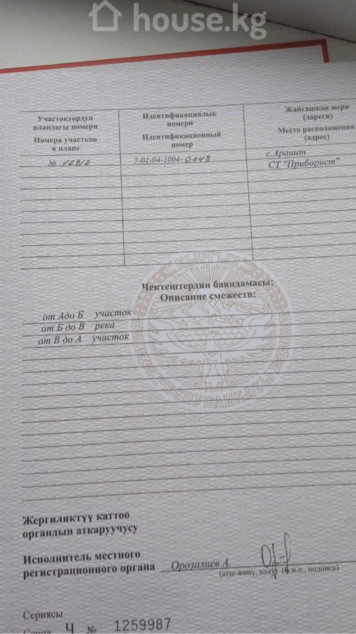 обл. Чуй, р-н Аламудунский, а/а Арашанский, с. Арашан, уч. СТ "Приборист", уч. 128/2.