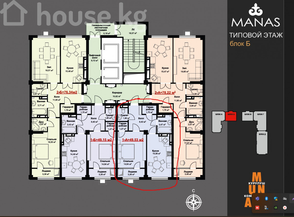 Продаётся 1-комнатная квартира в строящемся ЖК "Манас" от застройщика "Мунара Строй" Блок Б площадь 49,53 квм Сдача под ПСО — 1 квартал 2026 года Этаж 4 из 12 Локация: село Кок-Жар Характеристики: Железобетонный каркас Штукатурка стен 5-камерные окна Центральные коммуникации Подземный паркинг 💰 Цена: 49 000 долларов США Аида 0704999945 ID: 67954