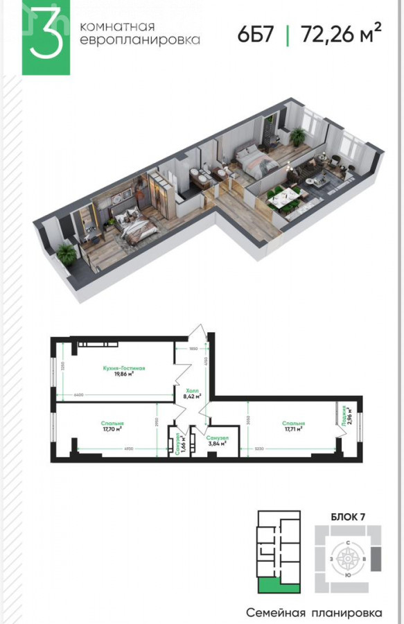 3-room apartment, 72.26 sq. m