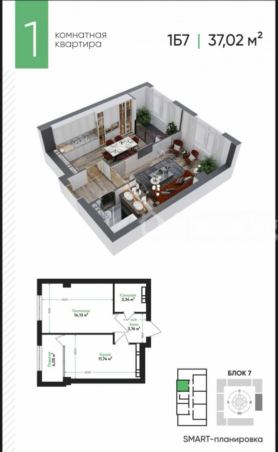 1-room apartment, 37 sq. m