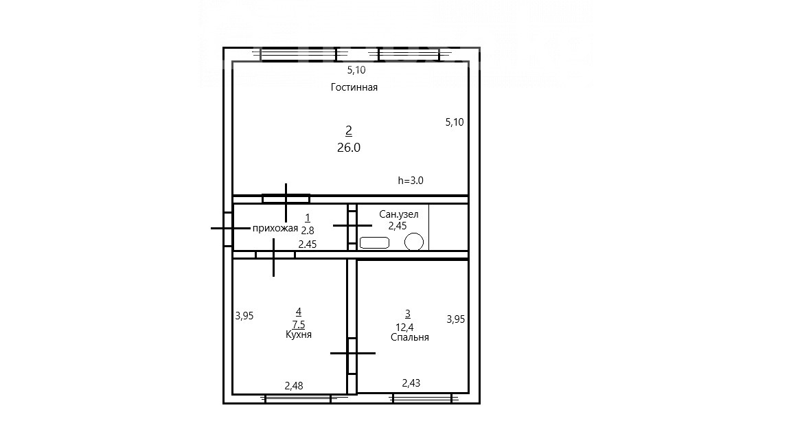 48.7 м2, жилая: 38.4 м2, кухня: 7.5 м2