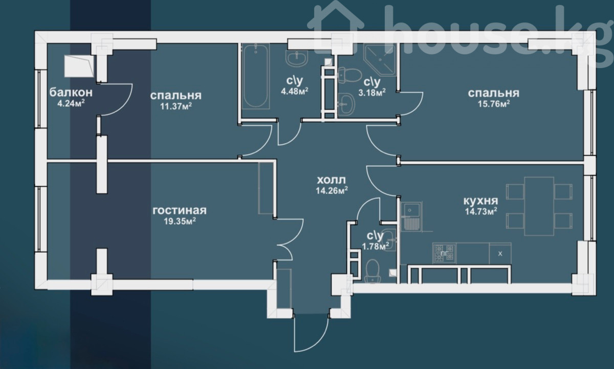 90 м2, жилая: 46.5 м2, кухня: 15 м2