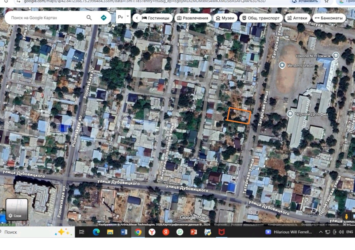 Земельный участок в центре города с домом 3 ком, с госактом (право частной собственности), техпаспорт г. Токмок. Участок 6 соток идеальной формы. Газ, вода, Канализация центральная, всё подведено к дому (участку) - Локация: Центр г. Токмок, ориентиры — ул. Татарская, ул. Дубовицкого, рядом школа №3 и садик √2. Участок отмечен на спутниковом снимке. - Инфраструктура поблизости: школа, садики, спорт школа, мэрия, площадь, магазины, учреждения услуг. Идеален для строительства жилья в центральной части города с готовыми документами частной собственности. Торг при осмотре, можно под ипотеку.