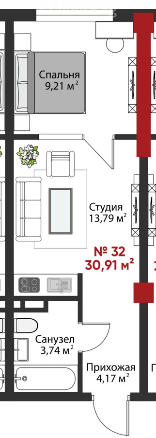 31 м2, жилая: 30 м2