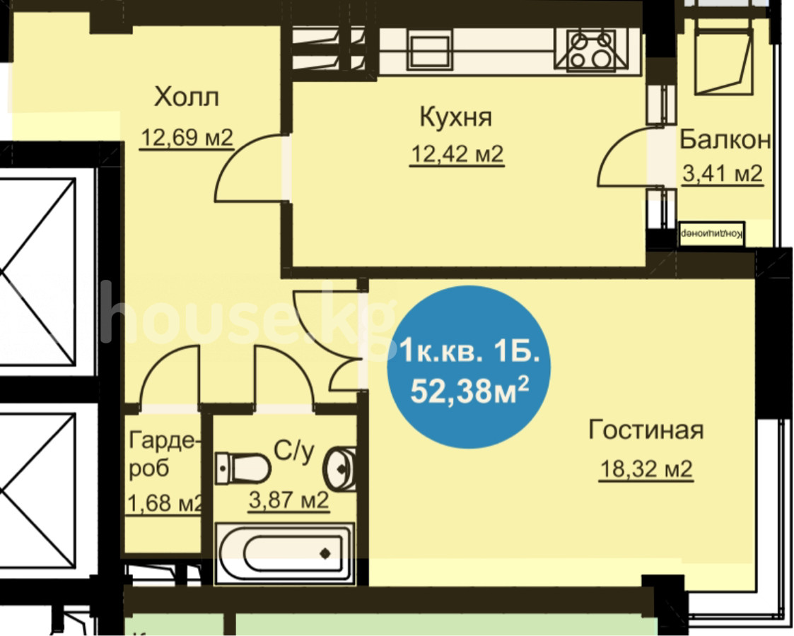 52 м2, жилая: 40 м2, кухня: 12 м2