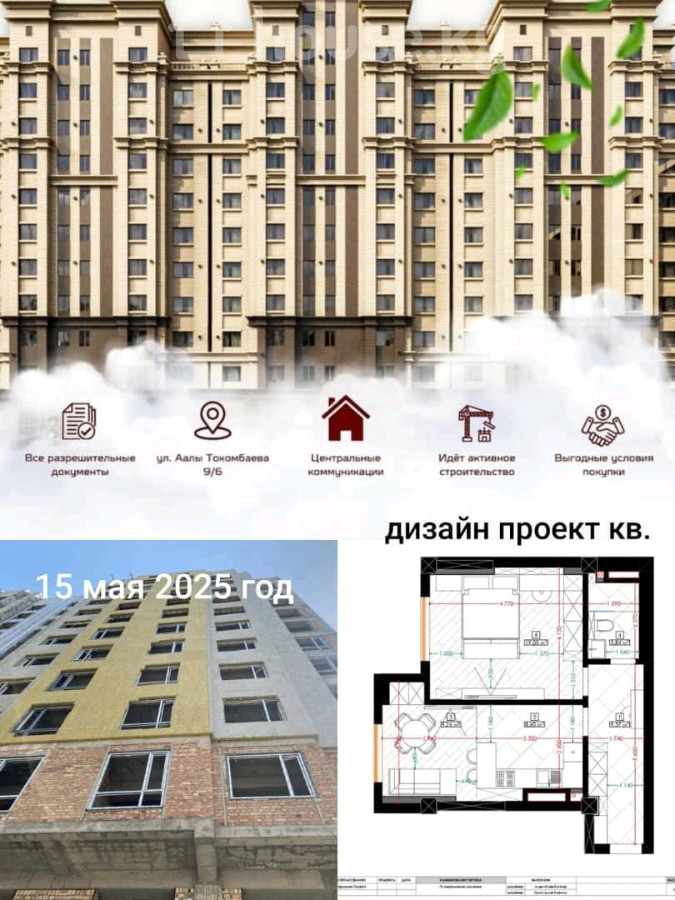 Продается 1-комнатная квартира под ПСО Площадь: 49,56 м² Этаж: 6 из 11 Строительная компания: Датка Курулуш Стадия строительства: ведутся фасадные работы, устанавливаются окна, завершена внутренняя штукатурка квартир Ожидаемая сдача под ПСО: конец 2025 года Локация: выше магистрали, недалеко от жилого комплекса «Елисейские поля» (СК Авангард) Дополнительно: разработан дизайн-проект квартиры Цена: 1 340 $ за м² Агентство недвижимости «Аска»