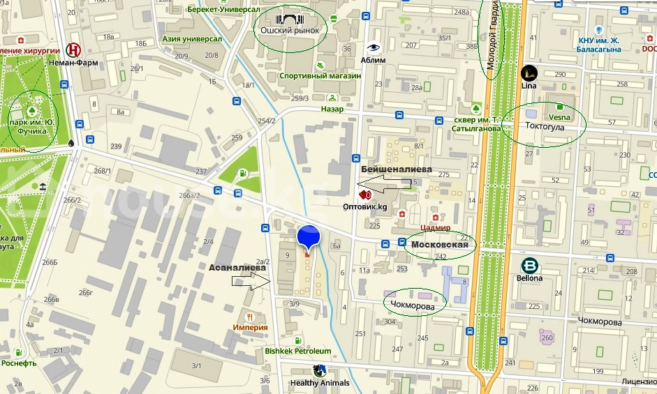 Продаётся участок 4,7 соток, в центре (Ошский рынок) Московская/Асаналиева * ориентир - мелькомбинат "Акун"(между рынками "Ош.базары" и "Баткен"), * можно под бизнес: склад, гостиница, автомойка, СТО и т.д., * коммуникации: свет, вода, газ и канализация, * дорога достаточно широкая, * жилой добротный дом 55 м2 в "подарок", * документы: красная книга, техпаспорт.