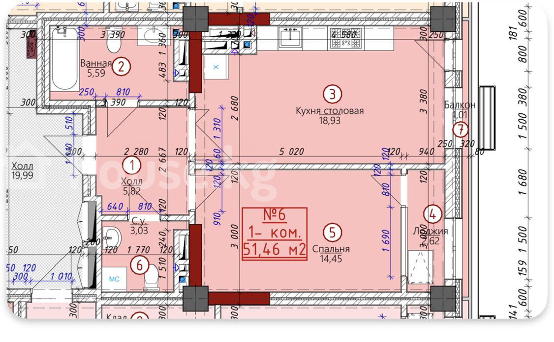 1-room apartment, 51.46 sq. m