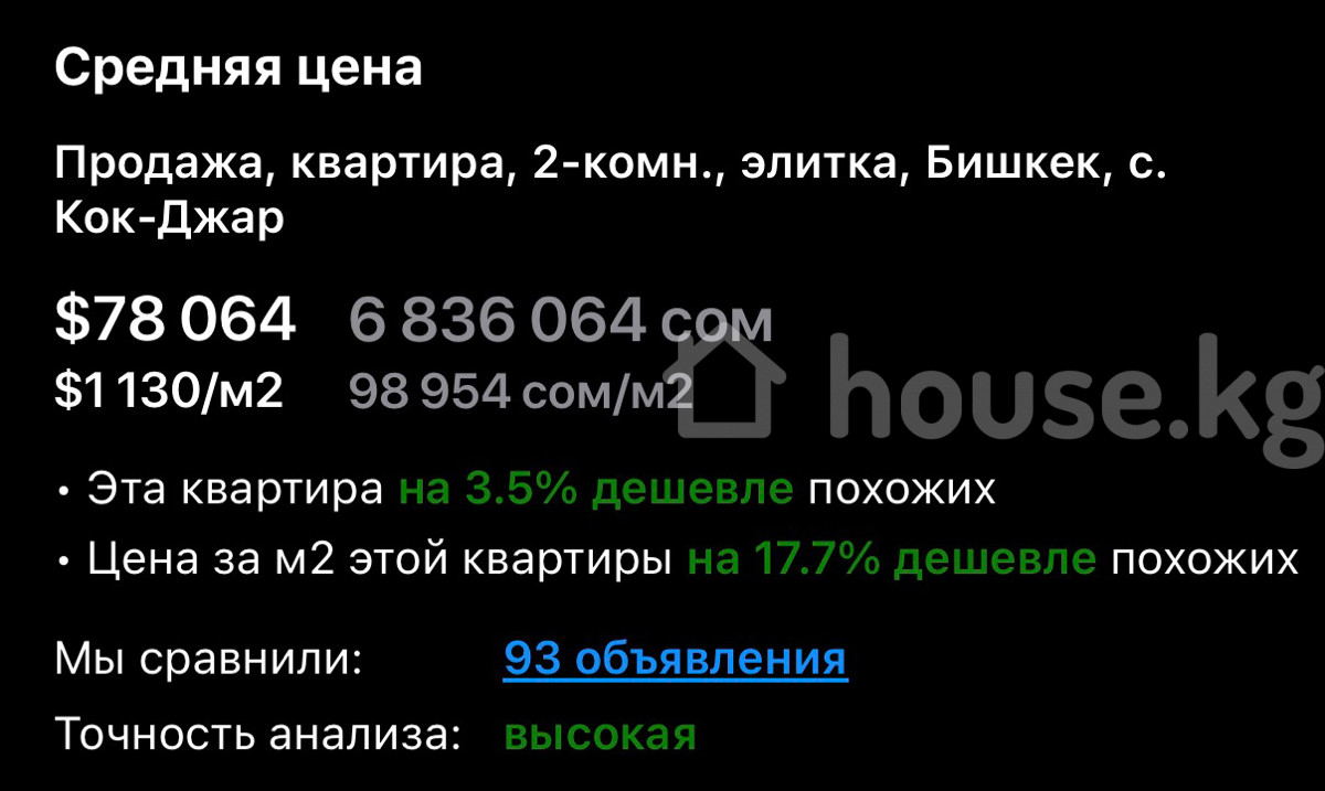 To compare real estate, House.kg uses such parameters as room number, series, location. These numbers may not match the market price, which is influenced by many factors. For more accurate data, use a professional real estate appraisal.