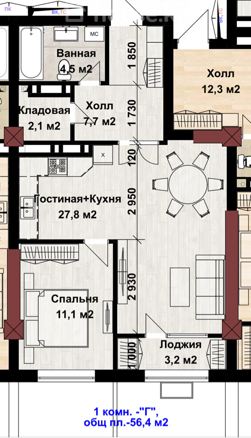 56 м2, ашкана: 27 м2