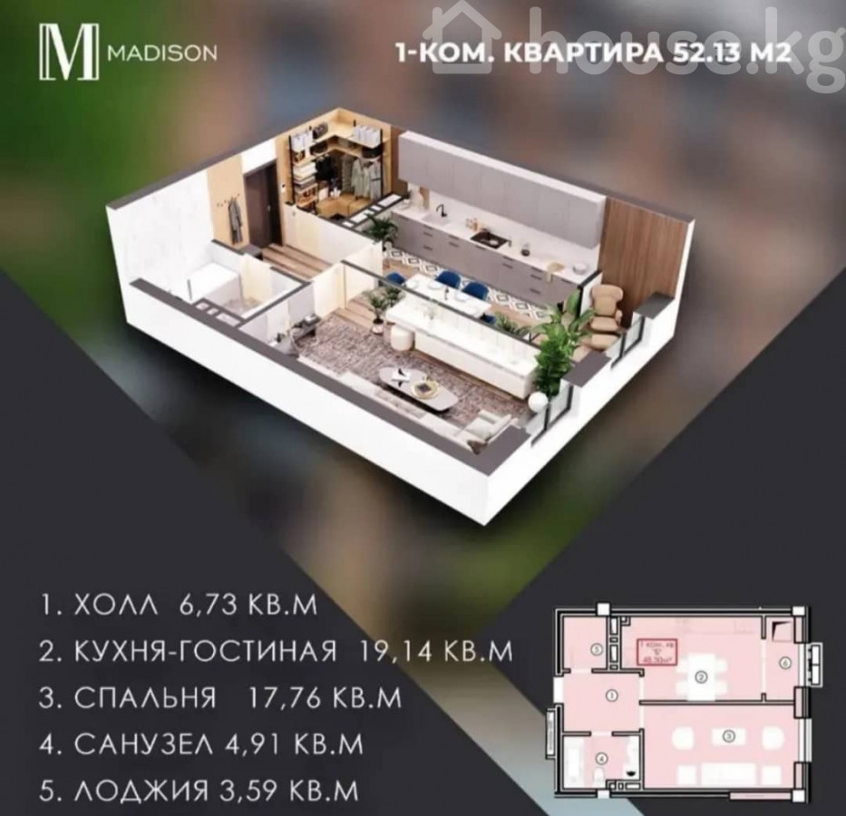 Продается 1- комнатная квартира 📍Адрес:Боконбаева- Шевченко 🏗️Застройщик: Cap Stroy 🏢 Жилой Комплекс: Madison 🏛️Серия: Элитка 🏬Этаж/Этажность: 8/16 📐Площадь: 52м2 💧Коммуникации: Центральные ♨️Отопление:Центральное 🚪Состояние квартиры: ПСО февраль 2026 🚽Сан узел: Совмещённый 📃Документы:ДДУ, Красная книга 💵 Цена: 78,000$ ID0020 Адилет