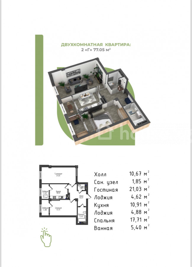 2-бөлм. бат., 77 м2