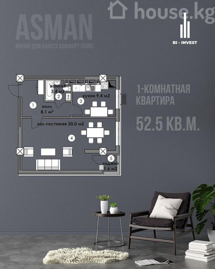 1-бөлм. бат., 52.5 м2