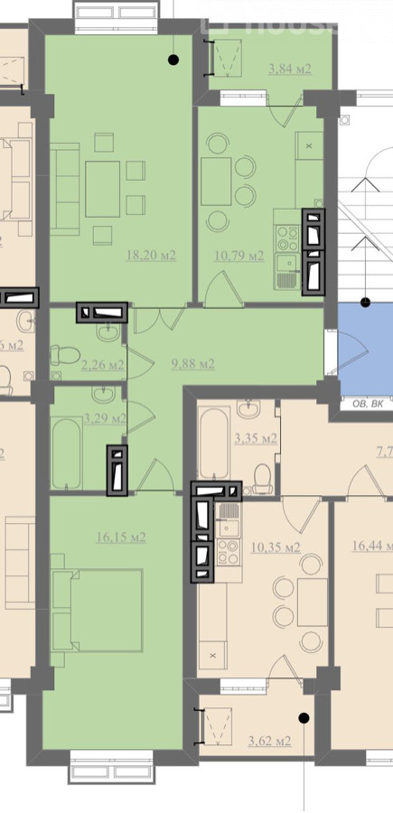 64 м2, турак жай: 55 м2, ашкана: 15 м2