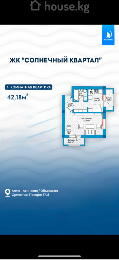 Срочно Продаю Квартиру, по ВЫГОДНОЙ цене! ПРОДАЮ 1-к. Квартиру. ПСО - 2 квартал,2026 год! ЖК "Солнечный" от компании "Корпорация Эльбрус". По улице ПМК-3, Экологически чистый район. Рядом расположены:Новый Автовокзал,Дордой,Silk Way. 7 км до Цума. Школы,садики,маркеты расположены в шаговой доступности! Общая площадь квартиры 42,18 кв. Квартира на 5 этаже из 5. ХОРОШАЯ ПЛАНИРОВКА. В комплексе Солнечный Квартал есть все условия для вашего комфортного проживания. Просторная детская площадка.Большой надземный паркинг. Огороженный двор. Видеонаблюдение. Регистрация ДДУ в Гос.Регистре!