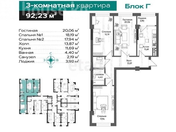 92.23 м2, турак жай: 56.19 м2