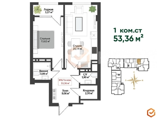 1-бөлм. бат., 53.37 м2