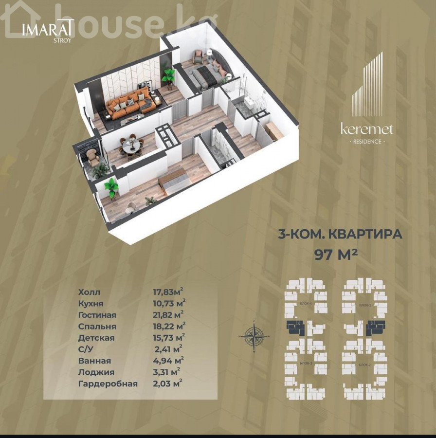 Продаю срочно 3-комнатная квартира в ЖК Keremet Residence Локация: ул. Бакаева / ул. Айни, рядом со сквером «Аллея Журналистов». Застройщик: Imarat Stroy , ИМАРАТ СТРОЙ Класс: бизнес+ Площадь: 97,32 м². Этаж: 13 из 17. Блок: 1 (окна на ул. Бакаева). Высота потолков: 3,30 м. Отопление: индивидуальное газовое. Документы: красная книга, ДДУ. Срок ввода (ПСО): 4 квартал 2026 г. Цена: 1250$/м² Особенности: - тихий центр, развитая инфраструктура - панорамные окна, продуманные планировки - современный жилой комплекс бизнес-класса.